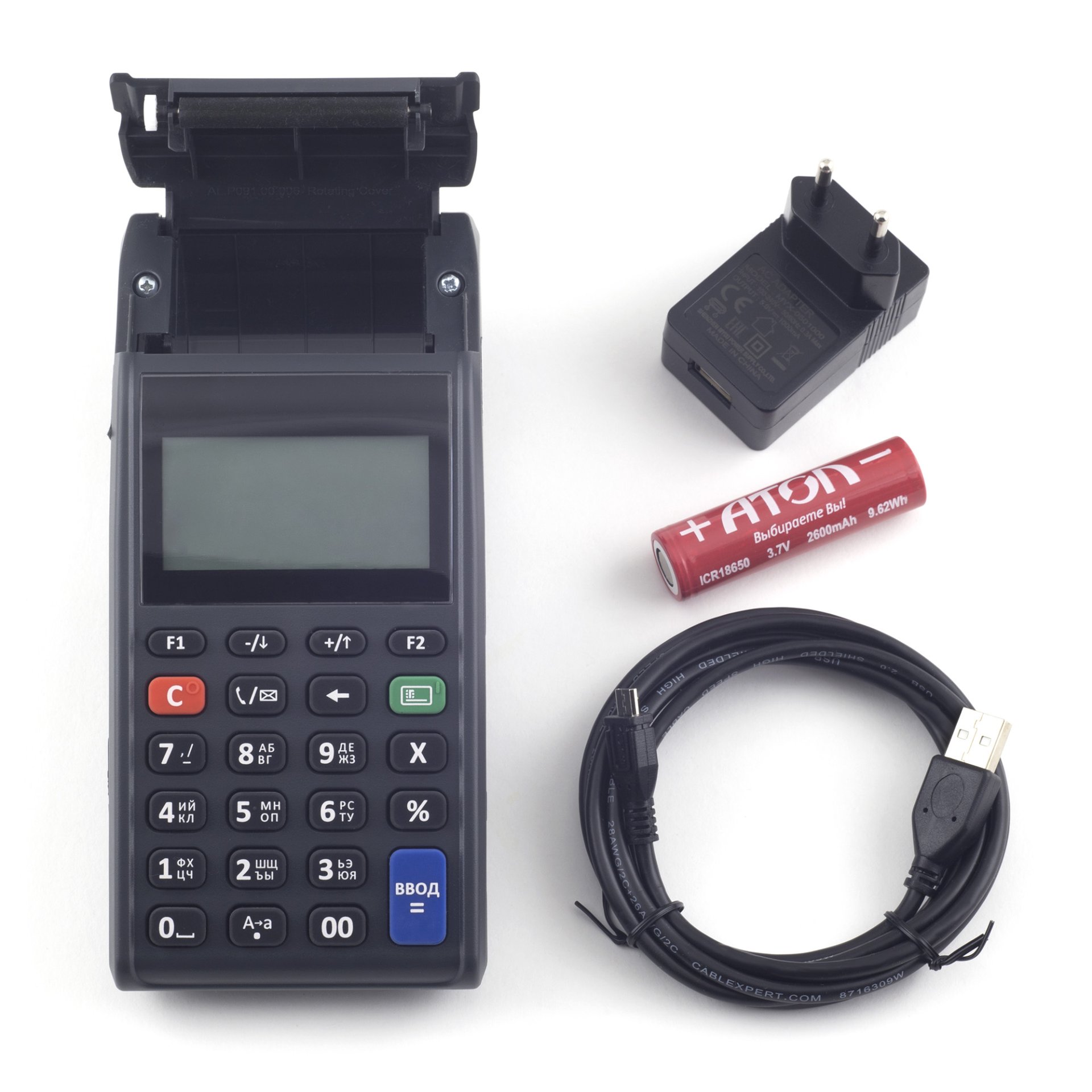 Комплектация: Краткое руководство по эксплуатации / Аккумулятор / Адаптер питания / Гарантийный талон / Паспорт / SIM-карта / Термобумага 57 мм / Кабель USB / miniUSB / Защитная пленка на экран