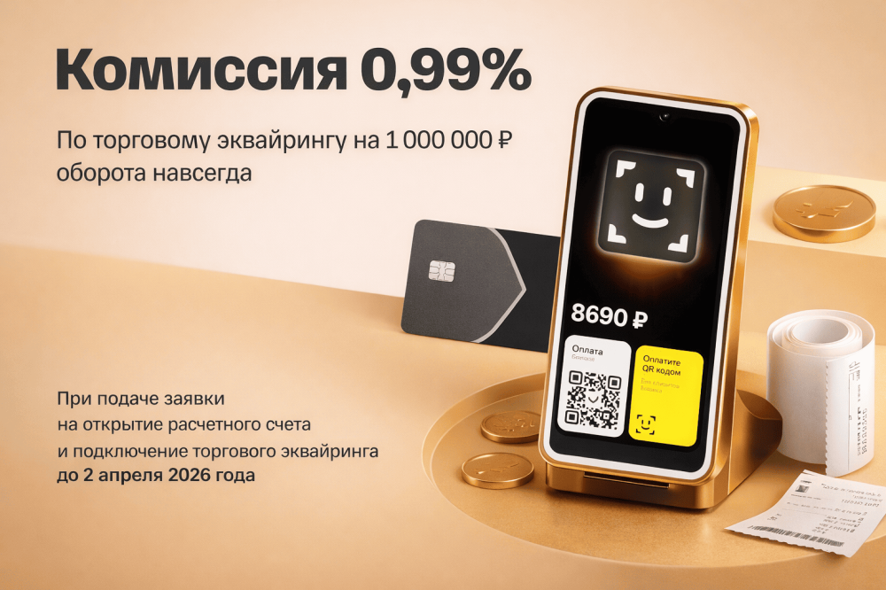 * Акция проводится с 18 февраля по 2 апреля 2026 года. Ставка 0,99% действует на оборот до 1 000 000 ₽ в месяц, без НДС, без минимальной ежемесячной платы. На оборот свыше 1 000 000 ₽ применяется стандартный тариф. Предложение действует только для новых клиентов Т-Бизнеса, не имеющих действующего расчётного счёта в Т-Банке. Организатор акции — Т-Банк (Т-Бизнес).